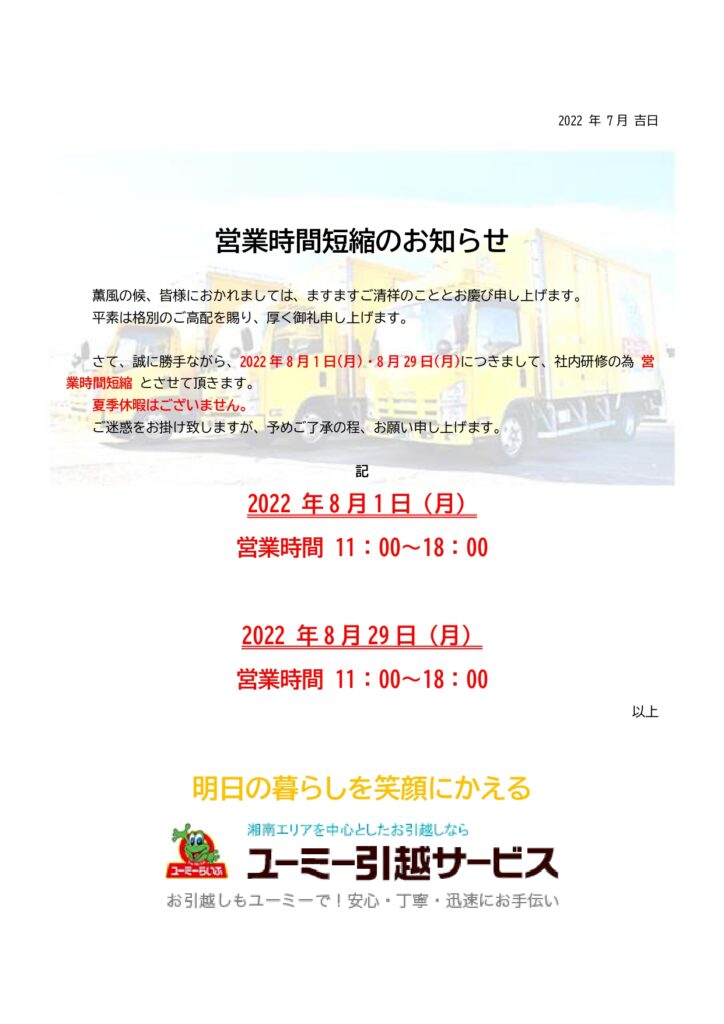 2022年7月31日 投稿ナビゲーション 前後 営業時間短縮のお知らせ カテゴリーお知らせ この投稿をシェア twitter facebook line 8月の営業時間短縮についてお知らせいたします。 ご迷惑をおかけいたしますがよろしくお願い致します。