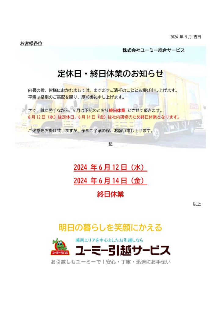 2024年5月29日 投稿ナビゲーション 前後 6月 定休日・終日休業のお知らせ カテゴリーお知らせ この投稿をシェア twitter facebook line こんにちは!ユーミー引越サービスです♪ 6月の定休日・終日休業のお知らせです。 お引越をお考えの方はお早めにお問い合わせください! 2024年6月12日(水) 定休日のため終日休業 2024年6月14日(金) 社内研修のため終日休業